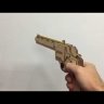 Потом вы взводите курок - точно так же, как на боевом оружии. Там это сложная система из металлических деталей причудливой формы, и она точно повторена здесь. Только из дерева. Поэтому стреляет игрушка подобно боевым образцам. Сперва взводим курок, затем нажимаем спусковой крючок. Курок щелкает, рычажок складывается вперед-вниз и отпущенная резинка вылетает в цель. Снова курок-спуск-выстрел... И так, пока не израсходуете все шесть резинок.